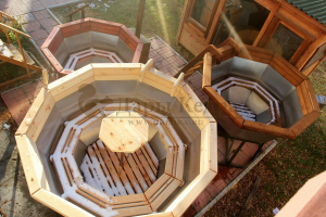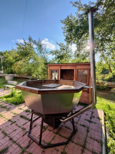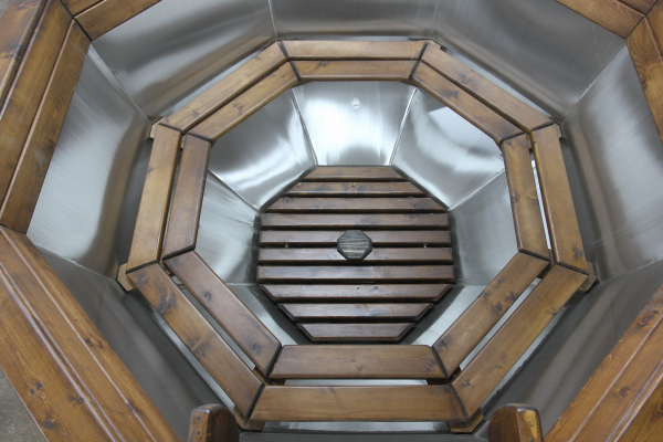 Банный чан на подставке изготовлен из пищевой стали. Представляет собой большую ёмкость в виде чаши, при нагревании которой можно париться на свежем воздухе. Чан установлен на устойчивую металлическую подставку и оборудован кедровым бортом, скамейками, подспинниками, трапом для ног и приставной лестницей. Нагревание банного чана происходит от обычного костра. Если оборудовать данную модель печью, то банные процедуры можно принимать даже зимой.