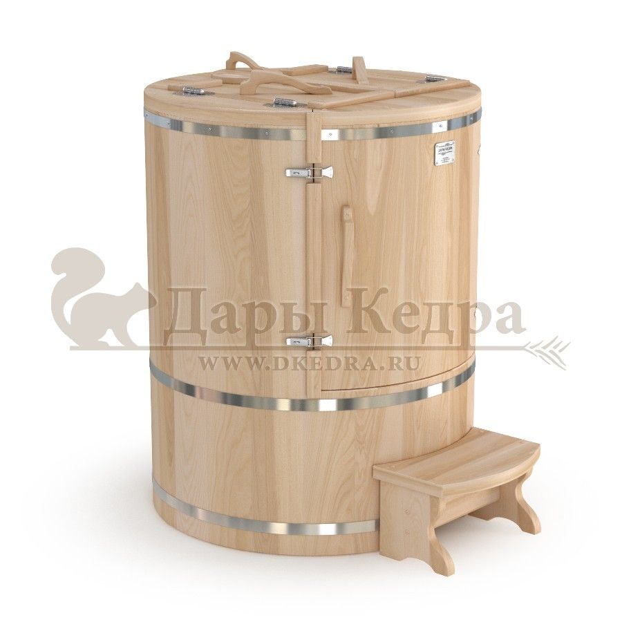 Готовый комплект «Универсальный»: кедровая бочка с парогенератором + био-защита изнутри и снаружи Готовый комплект - это полностью укомплектованный набор с фитобочкой для процедур парения. Овальная модель более просторна и удобна в использовании. Толщина стенок составляет 40-45 мм, что позволяет увеличить срок службы изделия. Верхний скос делает положение головы более комфортным и улучшает обзор. Фитобочка оборудована откидными створками, дверцей и отверстием для головы. Во время парения человек сидит внутри кедровой бочки, а голова находится снаружи. Благодаря этому исключается возможность перегрева. Подлокотники из кедра, встроенные ручки на створках и двери делают эксплуатацию более удобной. Парение в фитобочке благотворно влияет на организм в целом: повышается иммунитет, выводятся шлаки и токсины, улучшается работа органов тела и состояние кожи.