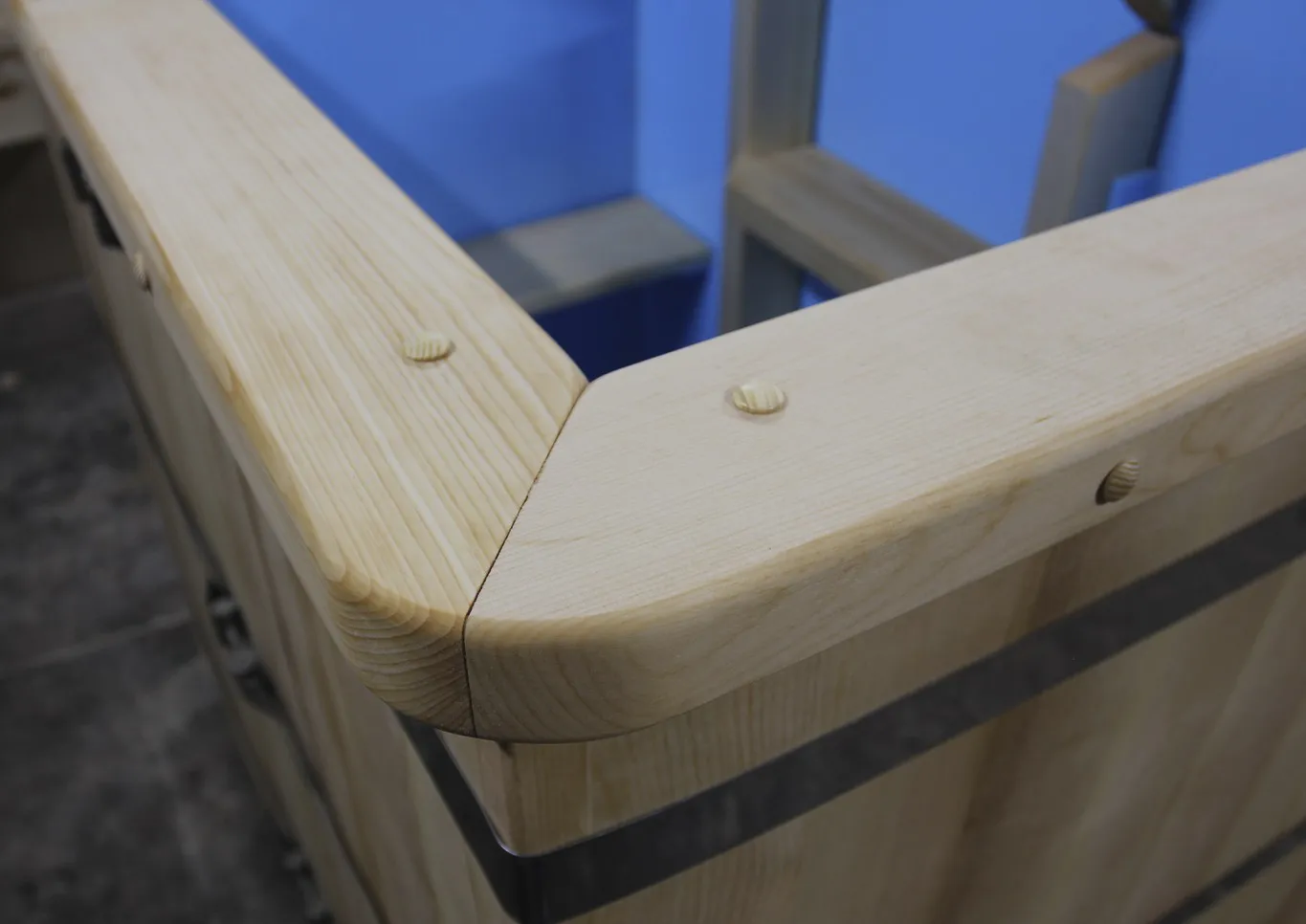 Особенность этой модели заключается в сборке купели по технологии лунный-паз. Паз (углубление) одной доски прочно соединяется с выемкой следующей. Такая сборка осуществляется без клея и гвоздей. Готовая конструкция прочно фиксируется нержавеющими обручами. Пластиковая вставка придает изделию красивый внешний вид, увеличивает срок службы и облегчает уход за купелью. Для удобства пользования купель оснащена лавочками, приставной и внутренней лестницей из кедра. Подходит для комнатного и уличного использования.