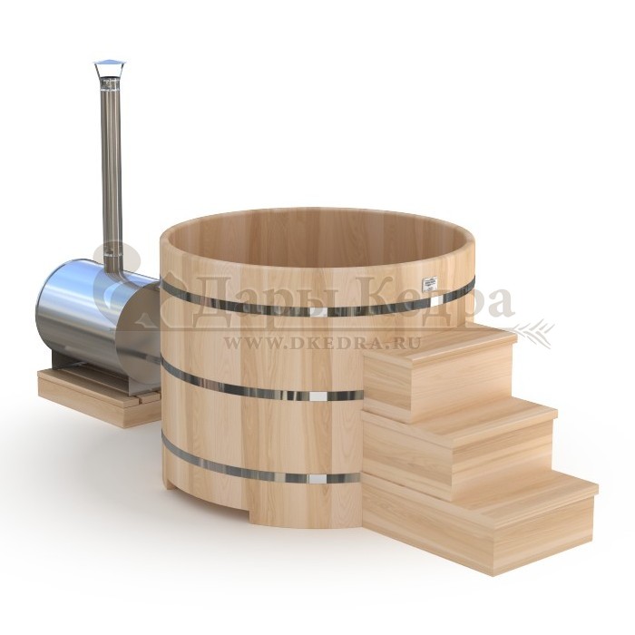 Фурако круглая из кедра со встроенной печью Это уличная баня, которой можно пользоваться круглый год. Купель представляет собой круглую емкость для воды, внутри которой располагаются сиденья из кедра. Нагрев воды происходит за счет встроенной печи, которая находится внутри купели за перегородкой. Рекомендуем приобрести термокрышку и весло для перемешивания воды для ускорения нагрева. Для удобства пользования японская баня фурако оборудована внешней и внутренней лестницей из кедра. В комплектацию этой модели входит совок с длинной ручкой, который позволяет извлекать угли и золу после эксплуатации изделия. Целебная древесина кедра богата фитонцидами и эфирными маслами, которые активируются при нагревании. Таким образом, во время процедур парения организм насыщается полезными веществами.
