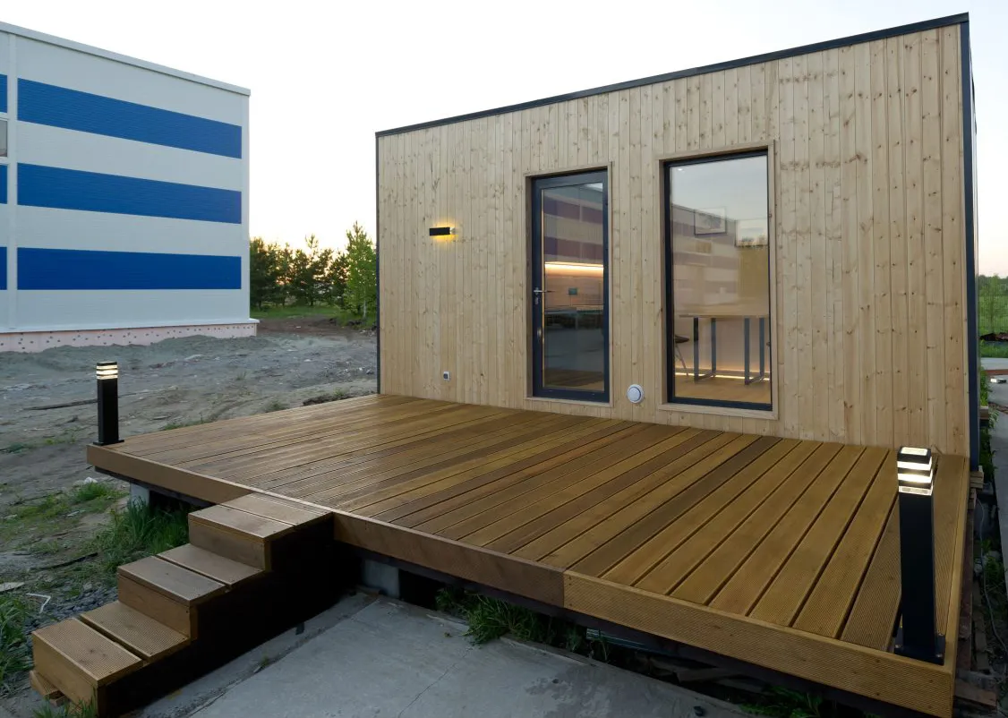 Это домик прямоугольной формы с панорамным окном и двумя помещениями: комнатой отдыха и санузлом с душевой зоной. Может быть изготовлен по готовым стандартам или вашим индивидуальным размерам. Современные материалы, используемые при проектировании, отличаются экологичностью и прочностью.