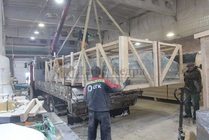 - Разборная каркасно-щитовая парная доставляется на самогрузе или длинномере. Во втором случае дополнительно заранее нужно будет заказать самогруз, чтобы произвести выгрузку из машины на свободное место.